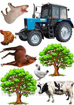 Розмір аркуша: А4, 20х30 см; трактор 12х15.5 см; кінь заввишки 10 см; корова — 6.5 см; дерева — 9 і 10 см.